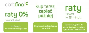 Można skorzystać z atrakcyjnej formy kredytowania lub odroczenia terminu płatności: Comfino – raty 0% (rozłożenie płatności na 10 równych i nieoprocentowanych rat), Comfino – niskie raty (rozłożenie płatności do 60 oprocentowanych rat – wysokość wraz z kosztami sprawdź w kalkulatorze) oraz Comfino – kup teraz, zapłać później (odroczenie terminu płatności o 31 dni).