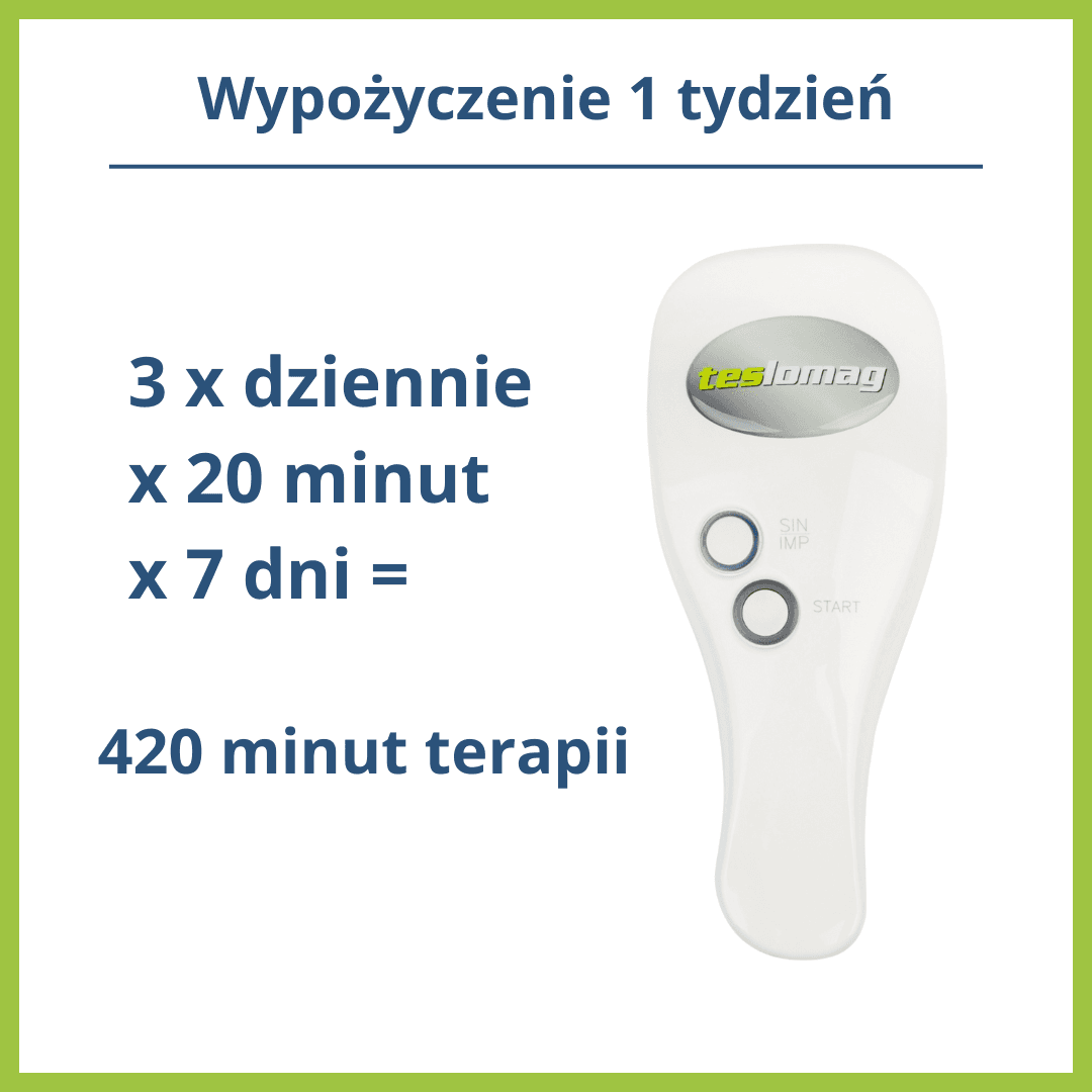 Wypożyczenie Teslomag na 1 tydzień sugerowane jest w przypadku konieczności zastosowania krótkiej i intensywnej terapii. W ciągu 7 dni przeprowadzisz 7 lub 14 – 20 minutowych zabiegów. Jeśli złamałeś nogę, skręciłaś kostkę, masz obrażenia po kontuzji lub operacji i jednorazowa seria zabiegów wystarczy do doprowadzenia do zdrowia – warto wypożyczyć Teslomag na tydzień. Opcję tę sugerujemy również wszystkim skierowanym na zabiegi pacjentom. Zamiast dojeżdżać do ośrodka zdrowia zabiegi możesz przeprowadzać w domu.
